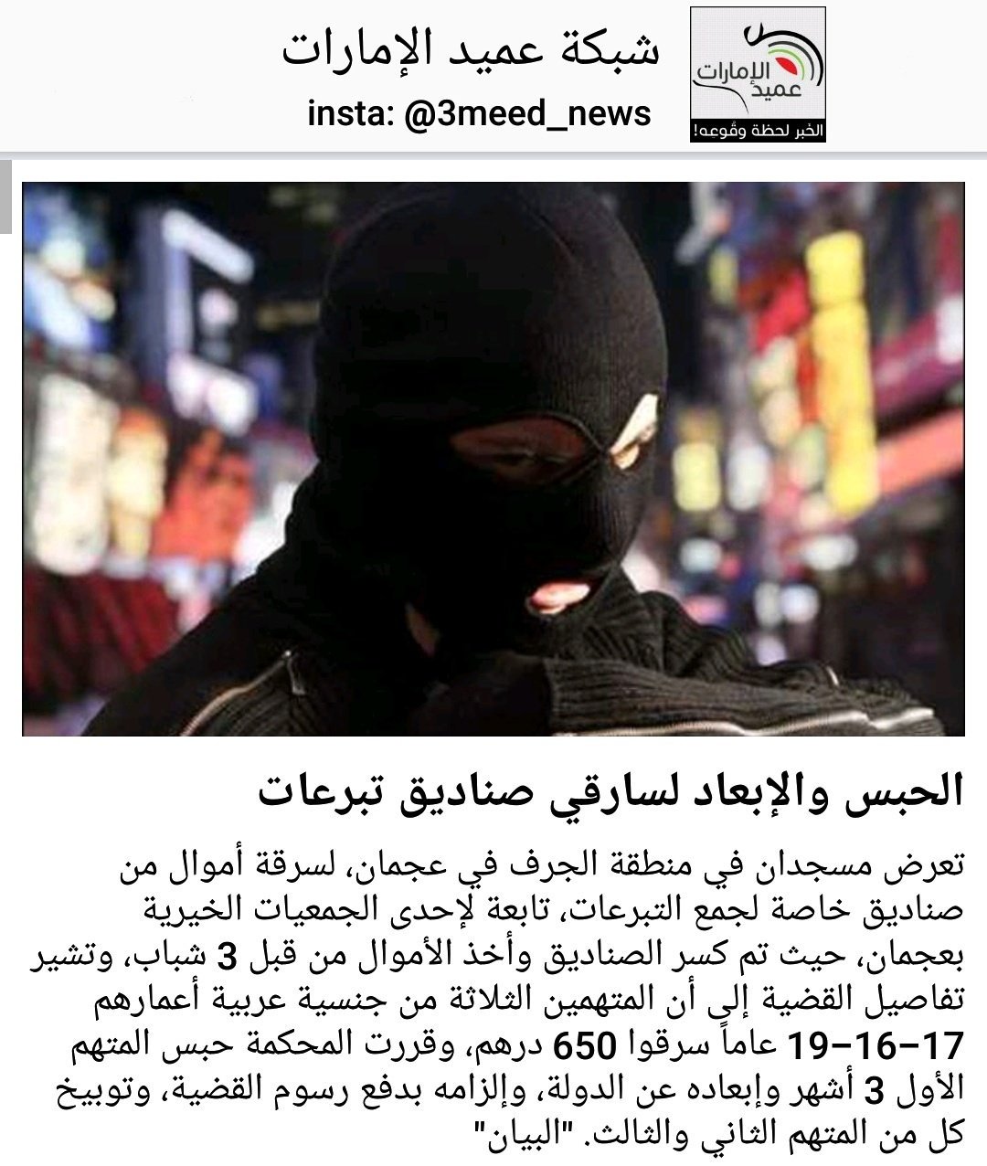 شبكة عميد الإمارات A Twitter تعرض مسجدان في منطقة الجرف في عجمان لسرقة أموال من صناديق خاصة لجمع التبرعات تابعة لإحدى الجمعيات الخيرية بعجمان حيث تم كسر الصناديق وأخذ الأموال من قبل